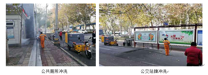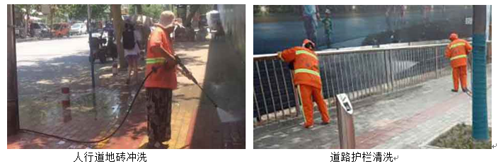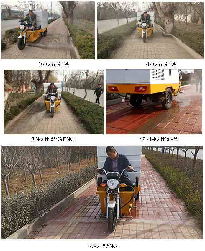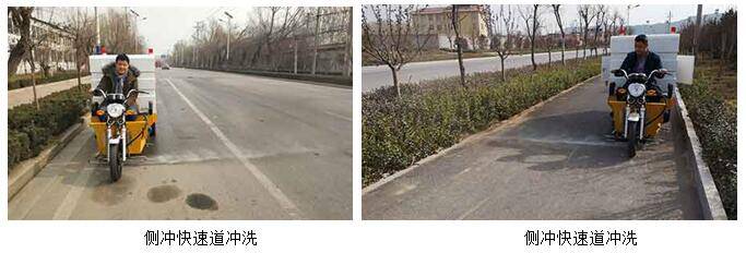 1、人行道冲洗:车辆体积小,运动灵活,配置各种角度喷头,冲洗角度可调整,可上人行道冲洗,也可在人行道下方冲洗,相比人工打扫效率高出数倍,效果更好。