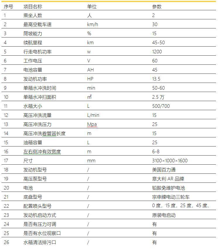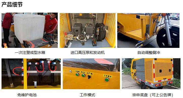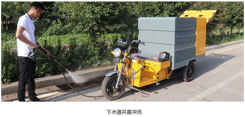 小型多功能高压冲洗车又称“小型高压水扫车”,具备多功能冲洗作业能力,主要用于城市人行道、辅道、路沿石的快速冲洗和保洁,以及城市小广告清理、果皮箱和垃圾桶冲洗、地面污垢去除、地砖还原本色、公交站牌冲刷、公共厕所冲洗等。可配合小型扫路机共同作业,对人行道和辅道进行快速保洁,作业效率更高。车辆体积小巧,重量轻,通过性强,且不会对人行道地砖,井盖等其他公共设施造成损坏。车辆配有作业报警装置,以及夜间反光条,适合白天、夜晚作业。的“工作速度模式”、“水位报警装置”、“高低速调整”可提高作业安全系数,采用电动三轮车底盘操作简单,普通环卫工人即可操作。