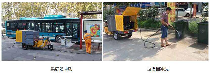 14. 配备手持式高压喷枪,旋转喷头,用于冲洗小广告、垃圾桶、地面垃圾。