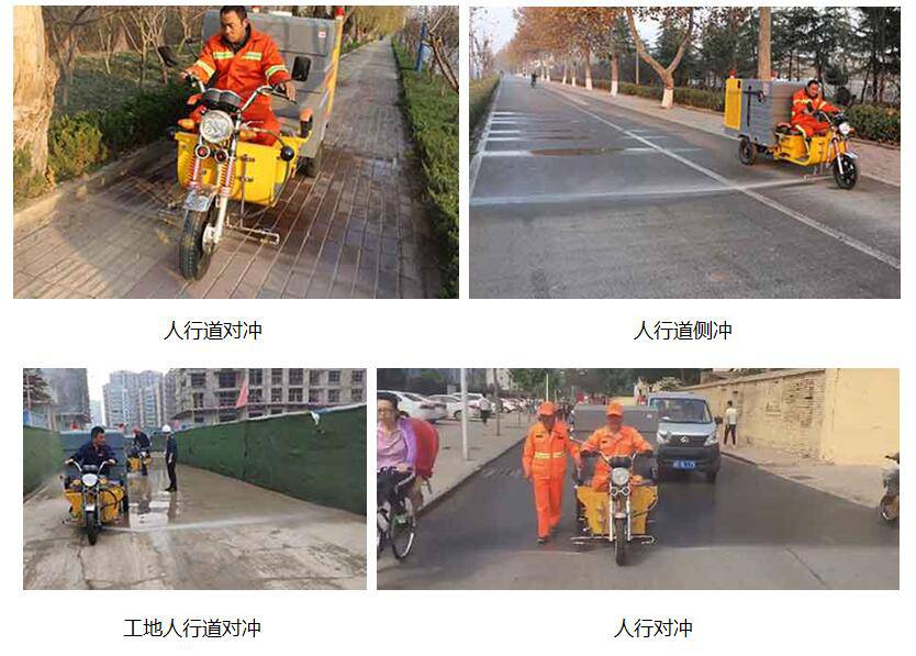 1、人行道冲洗:车辆体积小,运动灵活,配置各种角度喷头,冲洗角度可调整,可上人行道冲洗,也可在人行道下方冲洗,相比人工打扫效率高出数倍,效果更好。
