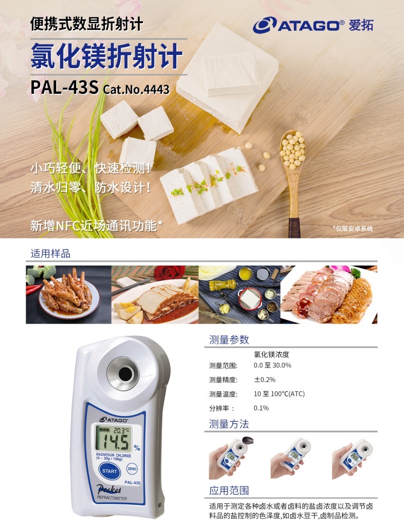 ATAGO(爱拓)便携式数显氧化镁折射计/卤水折射计,又称氯化镁浓度计 PAL-43S,适用于测定各种卤水或者卤料的盐卤浓度以及调节卤料品的盐度。如卤水豆干,卤制品检测。卤制品的配制卤水时浓度非常重要,直接影响卤水特有的风味,数显卤水折射计能快速测定含盐(氯化镁)溶液百分比浓度或折射率。