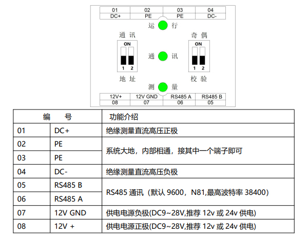 用户可以通过 RS485 通讯端口发送数据帧来实现:修改波特率,控制绝缘测量开始停止,