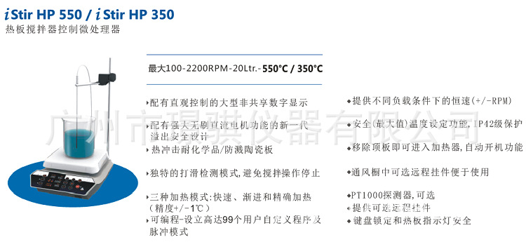 热板搅拌器微处理器控制,配有直接控制的大型非共享数字显示,配有强大的无刷直流电机100-2200RPM。 热板搅拌器控制微处理器