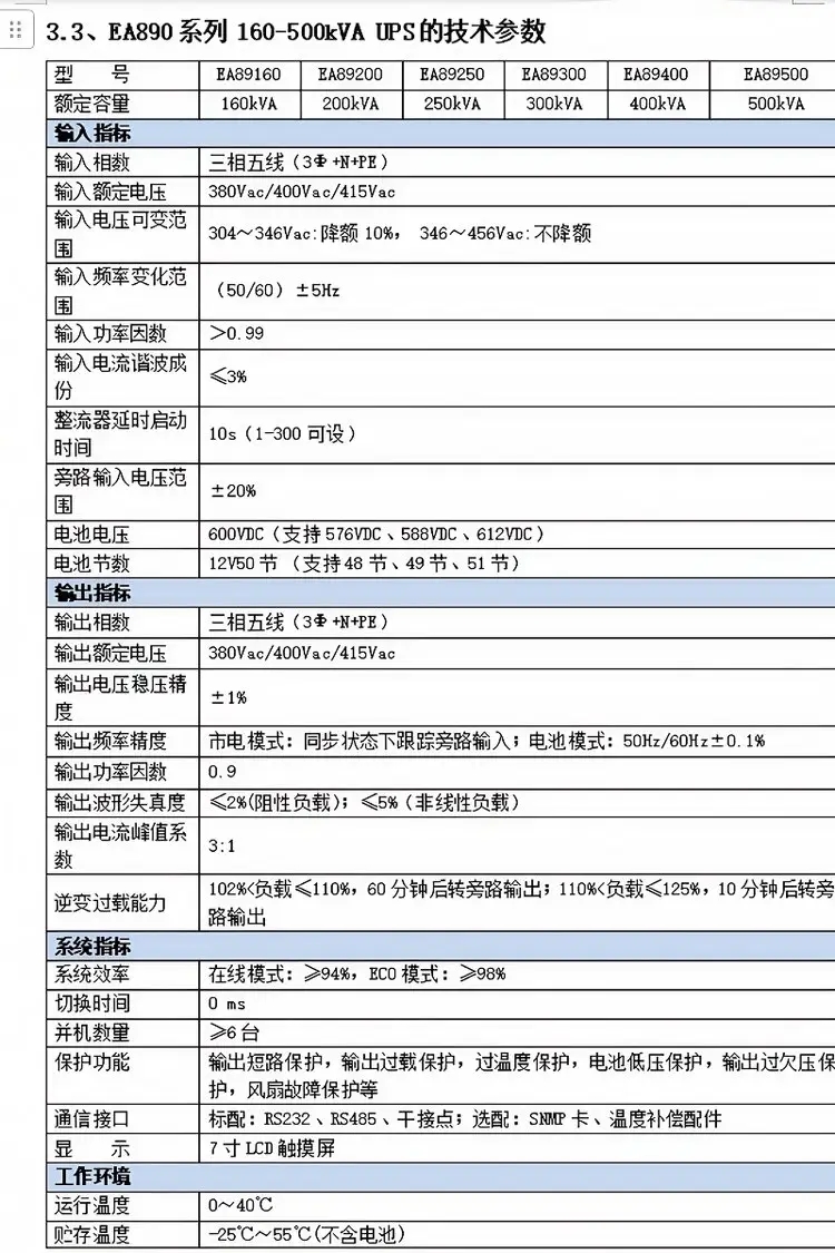以下是易事特(EAST)EA89400 UPS不间断电源的详细配置参数(基于常见规格整理,具体以数据为准):