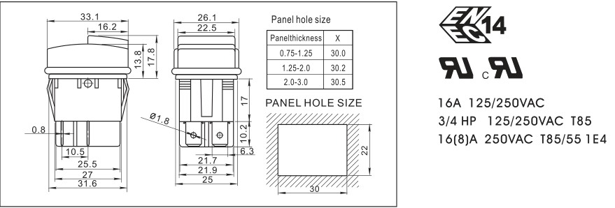 双排按扭开关33.1*26.1 功能ON-OFF4脚,按钮高低配置,导电性好,使用寿命达1万次。