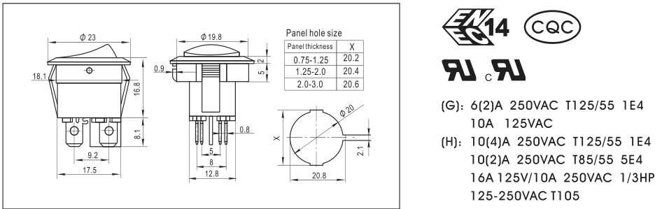 开关尺寸23*19.8MM,开关按键颜色可多样选择,产品带有ENEN/UK/KC/SGS认证。