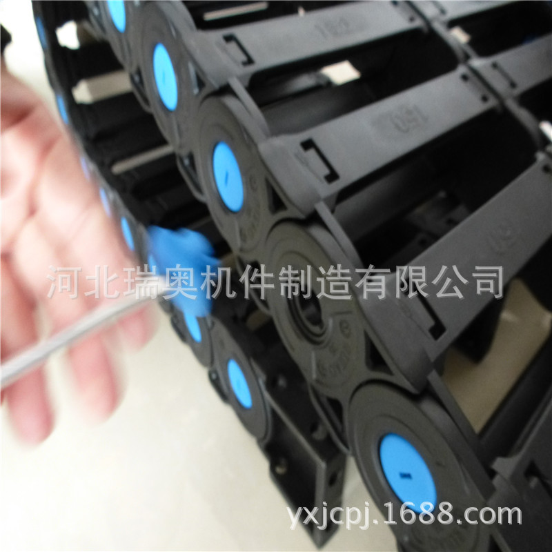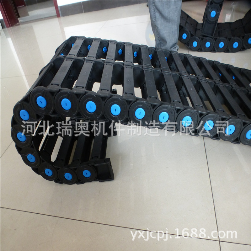 塑料拖链是我公司主打产品之一,可有效避免机械运行时对线缆的磨损,同时起到束线作用,使整体更洁净美观,质地优良,使用寿命可达500万次运行次数。选用增强尼龙为原材料注塑而成,具有高的压力和抗拉负荷,良好的韧性、高弹性、耐磨性、阻燃性、承重等特点。尼龙拖链每节都能打开,便于安装和维修。运动时噪音低、可告诉运动。