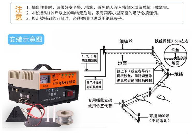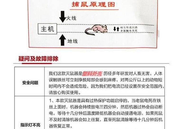 该款电鼠机电猫捕鼠器,可以用照明电,也可以用12伏的电瓶,非常的方便,也非常的安全,电猫捕鼠器对于2公斤以下的都是安全的。为了方便大家的购买,我们特开通了电猫捕鼠器全国的货到付款的业务。货到了才付款,安全又放心。买电鼠机电子捕鼠器,送支架,送铁丝,送老鼠引诱剂一斤。