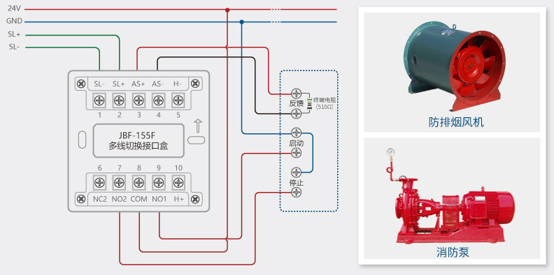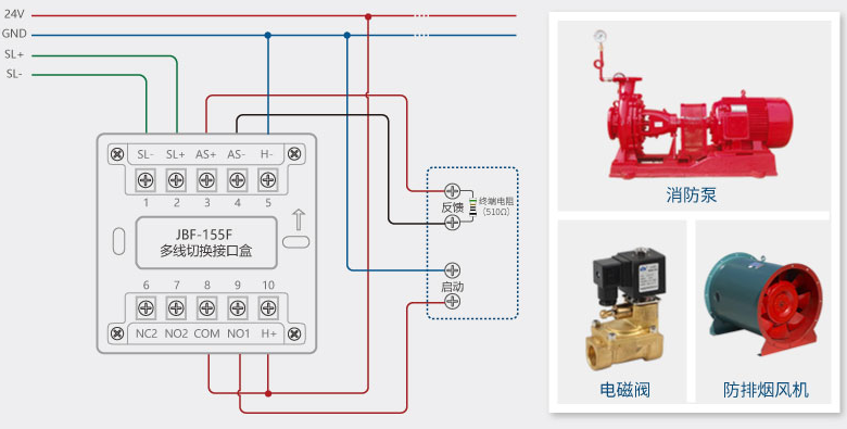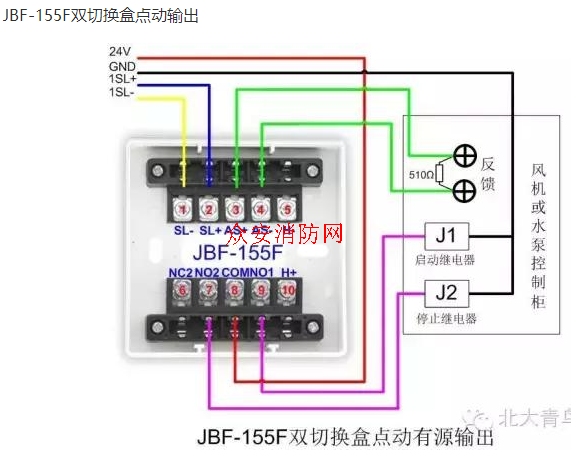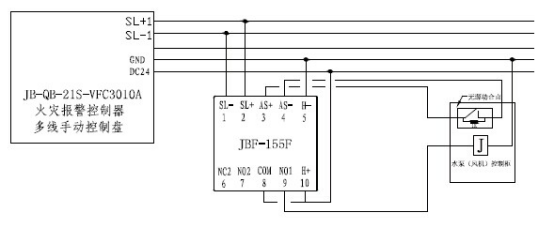 JBF-155F模块使用4条线,2条24V电源线,2条专线控制线与主机手动控制盘连接。