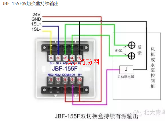 1、JBF-155F双切换接口盒持续输出,启动时端子(9)持续输出DC24V,停止状态下DC24V撤销。