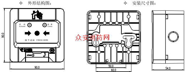 布线施工后,通过预埋盒或使用膨胀螺栓将底座固定在消火栓箱内的墙上,安装孔距为 60mm(兼容 50mm 安装孔距)。