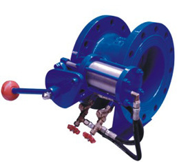 本阀主要由阀体、蝶板、调节阀、缓冲液压缸等组成。外部由调节阀连接。当水泵启动时,阀板在进口端水力和驱动液压缸下腔水力作用下缓慢开启至全开。关闭时介质回流推动阀板和活塞上腔回水压力的作用下迅速关闭90%截断大部分水流,再由缓闭液压缸阻尼进行缓闭,减弱回水压力的冲击,消除破坏性水锤。