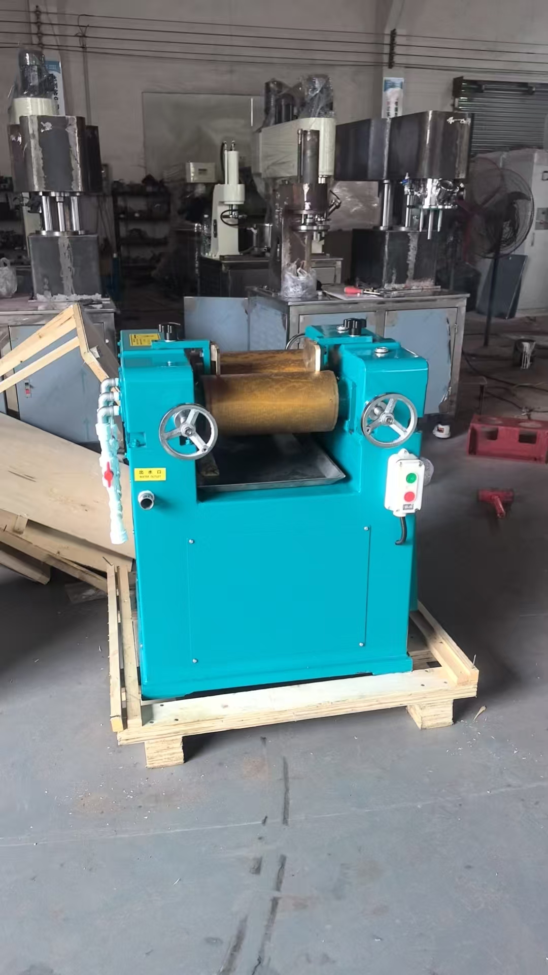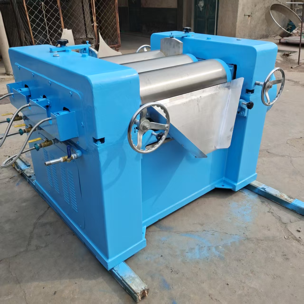 主要用于各种油漆、油墨、颜料、塑料、化妆品、肥皂、陶瓷、橡胶等液体浆料及膏状物料的研磨。三辊研磨机有三个滚筒安装在铁制的机架上,中心在一直线上。可水平安装,或稍有倾斜。是通过水平的三根辊筒的表面相互挤压及不同速度的摩擦而达到研磨效果。钢质滚筒可以中空,通水冷却。物料在中辊和后辊间加入。由于三个滚筒的旋转方向不同(转速从后向前顺次增大),就产生很好的研磨作用。物料经研磨后被装在前辊前面的刮刀刮下。通常情况下三辊研磨机的辊筒材质为冷硬合金铸铁离心铸造而成,表面硬度达HS70°以上;辊筒的圆径经过高精密研磨,细腻,能使物料的研磨细度达到15μm左右,因此能够生产出均匀细腻的高品质产品。SM405、S260型三辊机用于批量生产,S150、S65型用于小批量或实验室用。