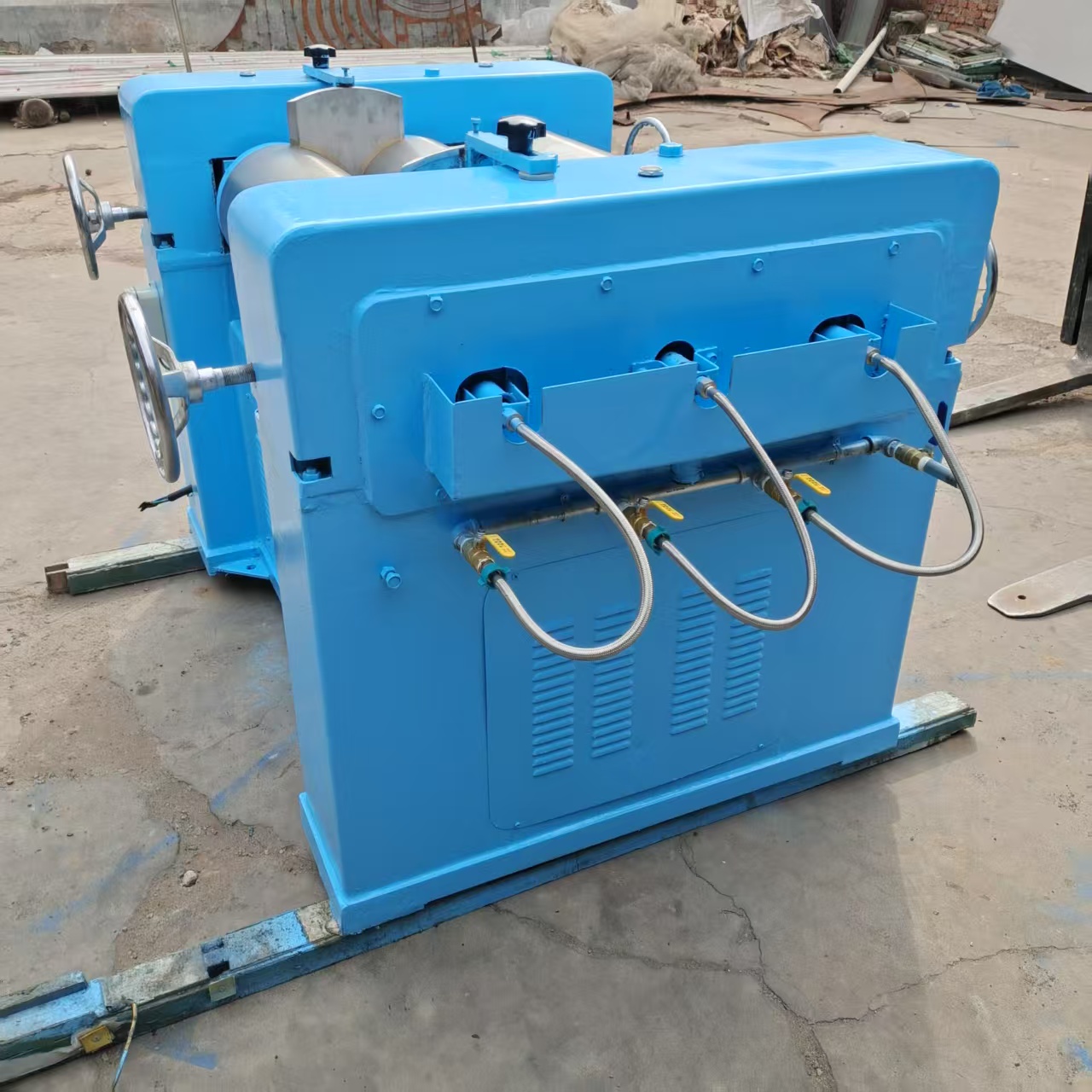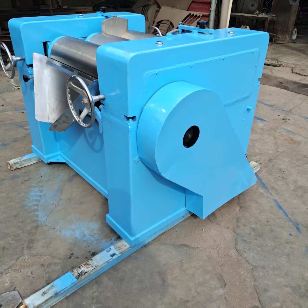 三辊研磨机维护保养:三辊机连续使用半年以后,建议进行一次大修,将各处的洗动部分加以拆洗,重新换上洁净的润滑油,并仔细检查油路的畅通情况,在拆洗中发现问题时应及时修复。在使用时发现辊筒变形,必须停止使用,重新修磨。辊筒修磨次数过多,辊筒直径小于要求以后,会产生传动齿轮顶紧而辊筒相互之间留有缝隙的现象,此时齿轮必须修正。出料刀片的锋口在安装前应仔细修正,精研光滑,不允许留有洒刺和裂口,刀片用短以后,可以拧松沉头螺钉,向外移出再用。