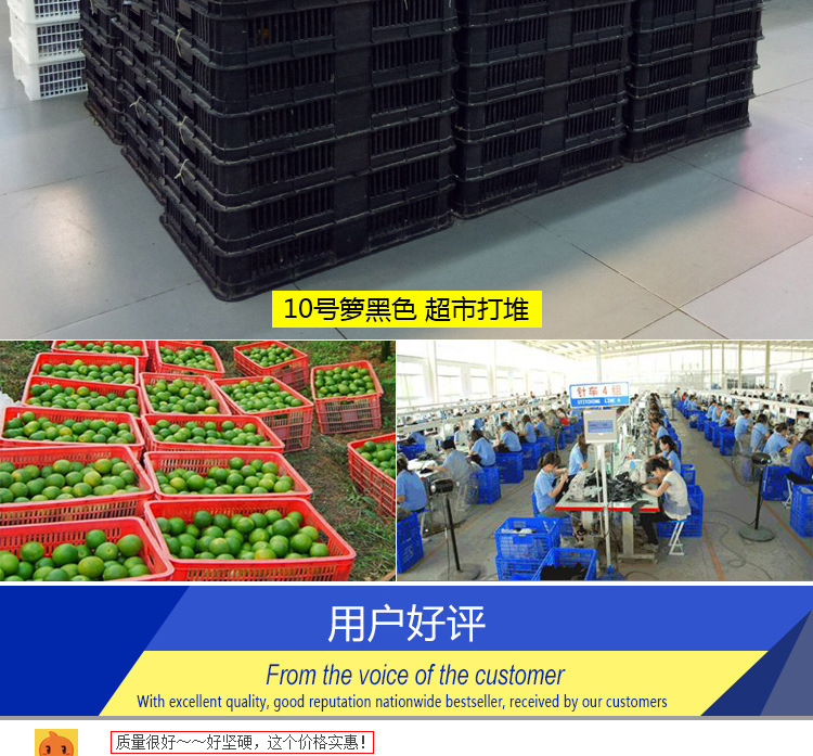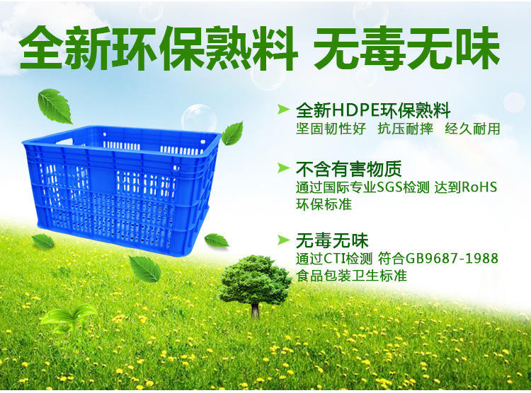 名称:塑料周转箱材质:高分子聚乙烯(HDPE)可以提供第三方食品行业应用检测报告工艺:注塑*体成型载重量:35kg颜色:默认库存为蓝色、500只塑料周转箱起可以定制颜色外观:实心设计,可以达到防潮效果,平口设计,塑料箱四周和底部均设计有加强筋,增加塑料箱的牢固性和使用寿命,塑料箱两端设计有实心把手,方便塑料箱搬运和周转,塑料箱的四角均设计有防撞加强筋,防止塑料箱在使用过程中被撞坏,所以塑料箱角上设计的加强筋可以减缓撞击力,从而减少塑料箱因被撞击而损坏。塑料箱制造商:重庆市赛普塑料制品有限公司个性定制:塑料箱上可以定制公司商标、公司名称、产品名称等。