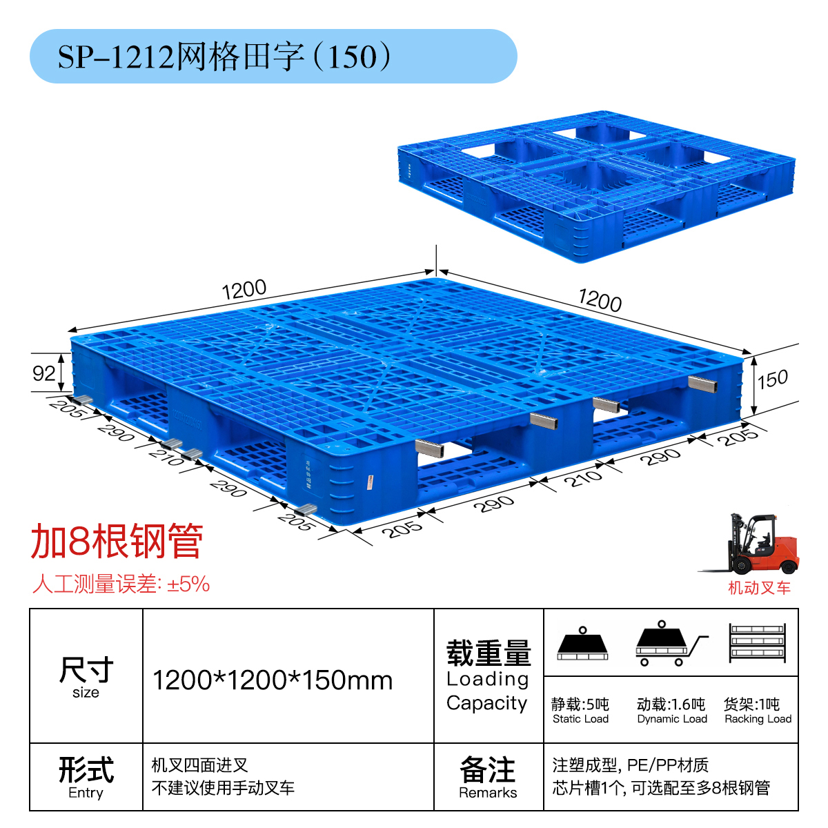 托盘可加8根镀锌钢管,面部4根,腿部4根,可上货架。