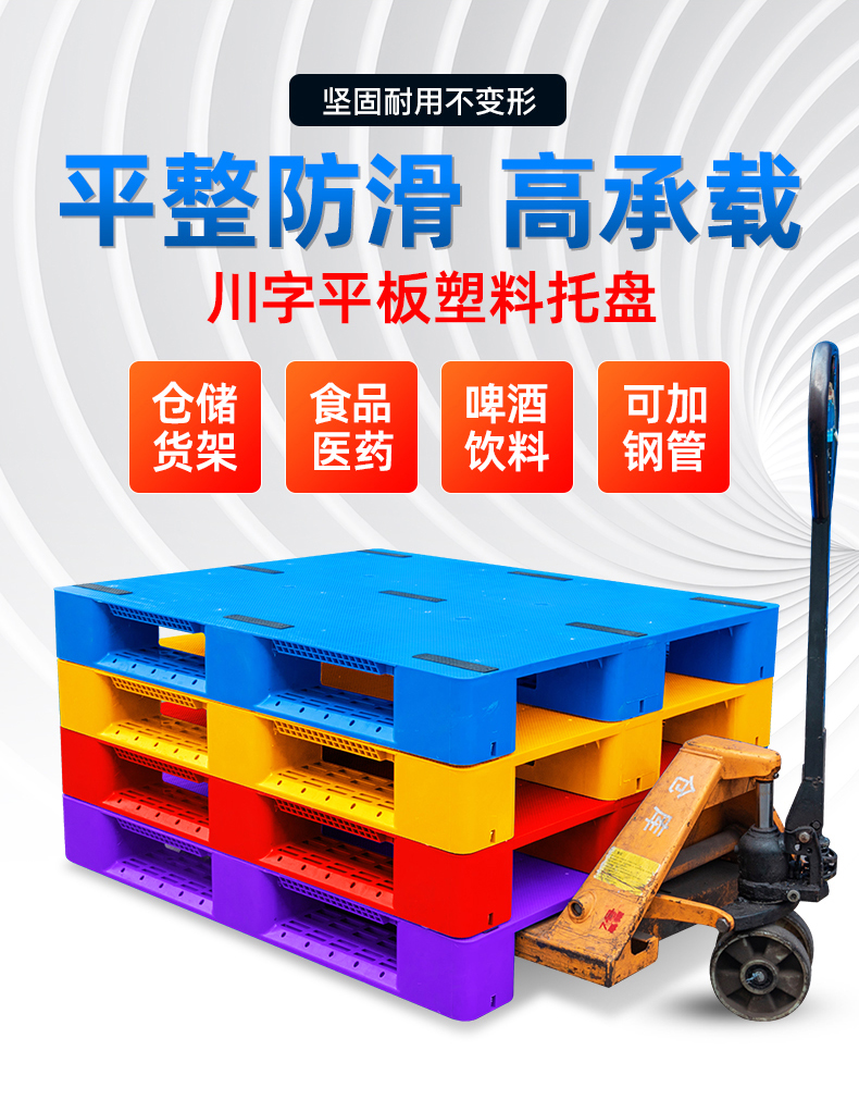 塑料托盘耐热,耐寒性能优越,±30°内不变形,遇酸碱腐蚀抗性强。