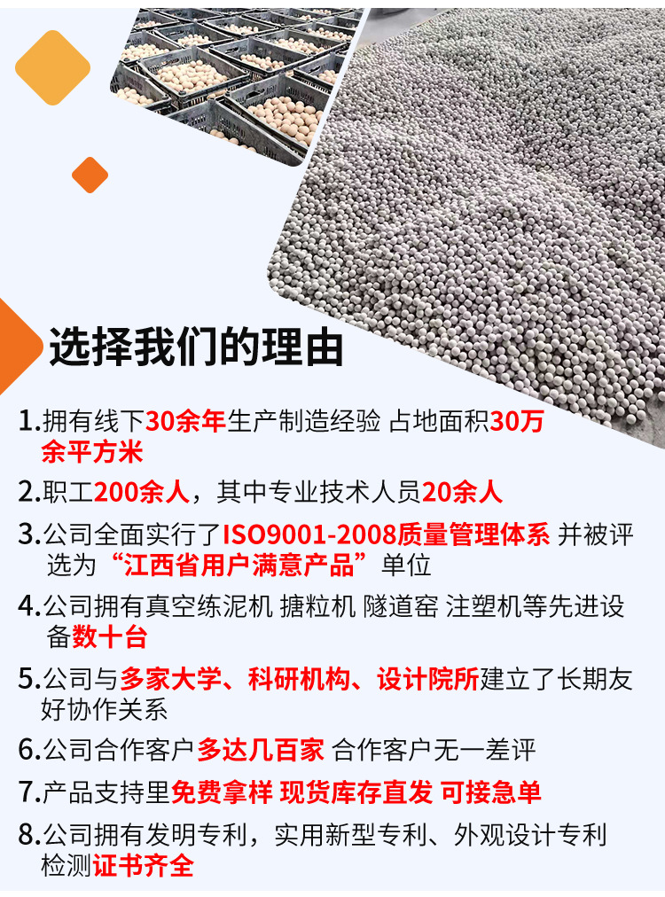 ●特别具有优良的耐化学腐蚀性能:除外,能耐所有的和有机酸及所有的酸性气体、中性气体。除非产品遇原料气、液中杂质污染需清洗或更换外,在化工工艺设备中充当催化剂覆盖、支撑剂、保护剂使用,产品本身不会出现问题,保证使用寿命。