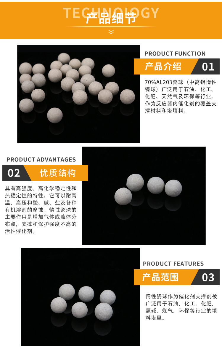●惰性氧化铝瓷球是一种高强度、高空隙率的新型支撑、覆盖及保护催化剂用球形支撑保护填料。