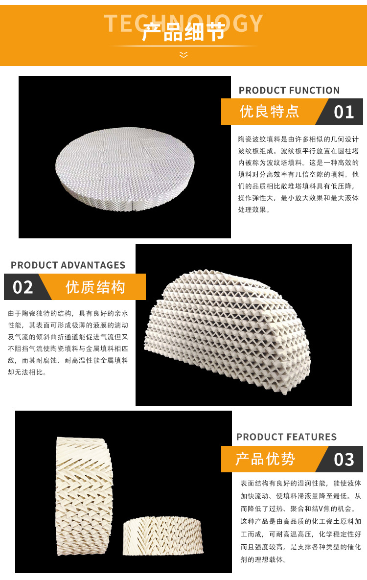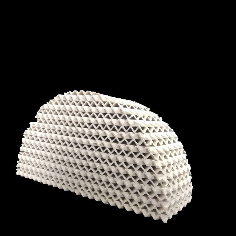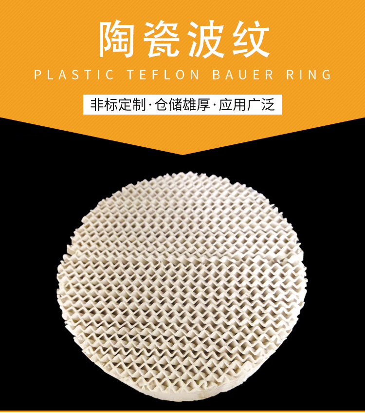 陶瓷波纹填料由许多相似的几何设计波纹板组成。波纹板平行放置在圆柱塔内被称为波纹塔填料。这是一种较高的填料对分离效率有几倍空隙的填料。他们的品质相比散堆塔填料具有低压降,操作弹性大,较小放大效果和较大液体处理效果。