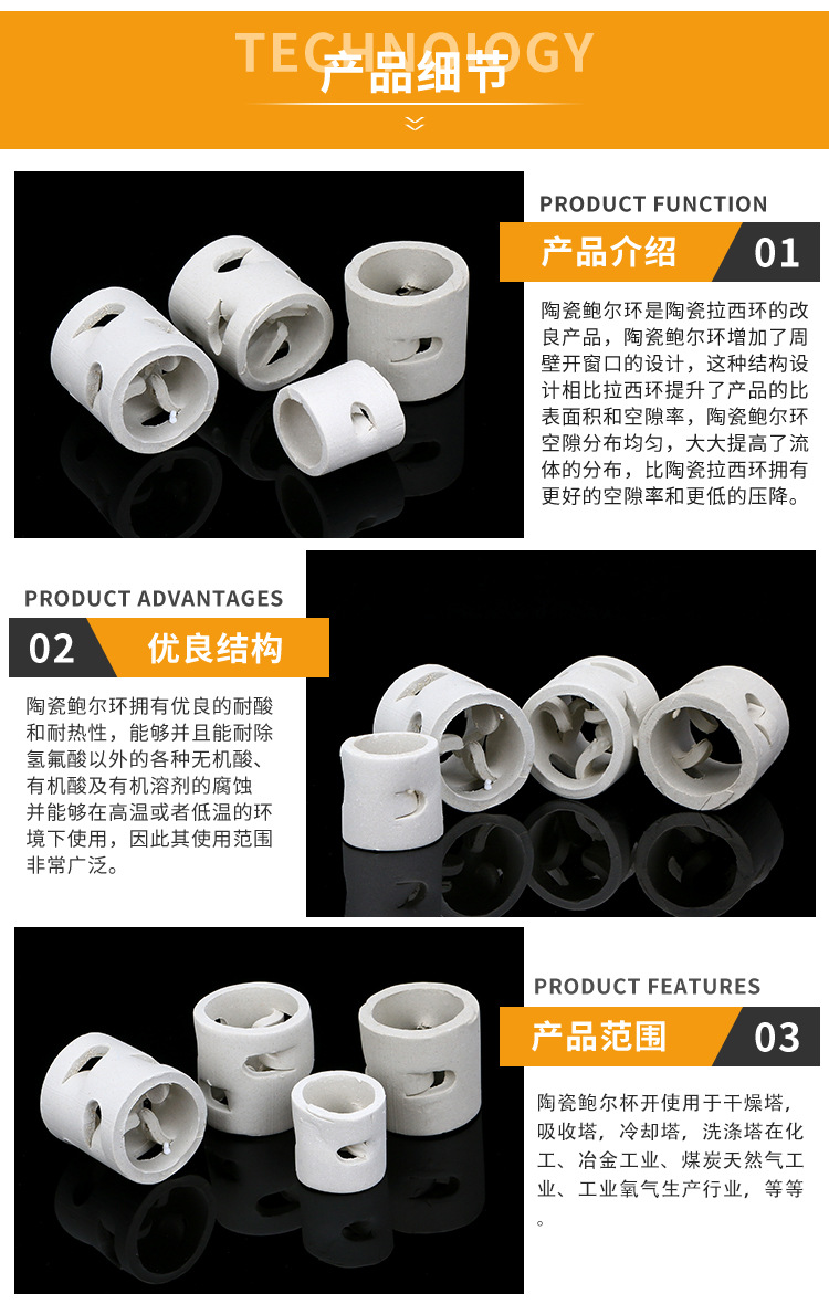 ●陶瓷鲍尔环拥有优异的耐酸和耐热性,能够并且能耐除以外的各种、有机酸及有机溶剂的腐蚀,并能够在高温或者低温的环境下使用,因此其使用范围非常广泛。