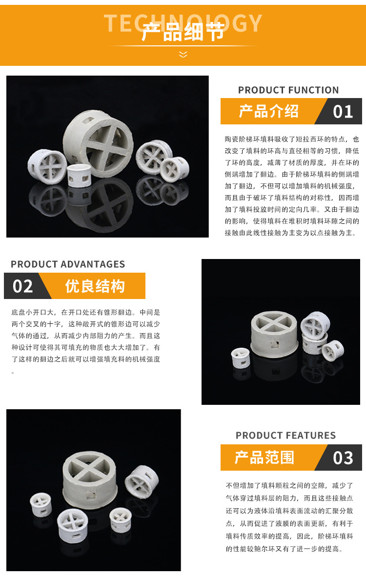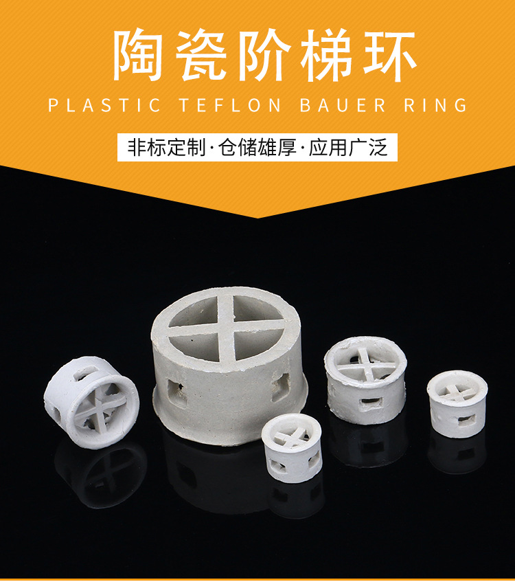 产品介绍:陶瓷阶梯环拥有优异的耐酸和耐热性,能够并且能耐除以外的各种、有机酸及有机溶剂的腐蚀,并能够在高温或者低温的环境下使用,因此其使用范围非常广泛。陶瓷阶梯环可使用于干燥塔,吸收塔,冷却塔,洗涤塔在化工、冶金工业、煤炭天然气工业、工业氧气生产行业,等等。
