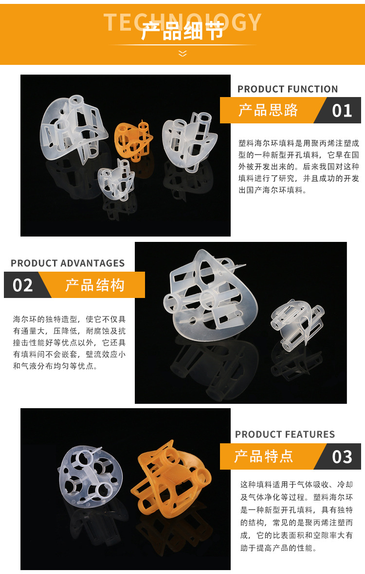 | 应用领域 | 气体吸收、酸性气体吸附系统、洗涤塔、肥料生产。用于气体吸收塔、酸性气体吸附系统、肥料生产。塑料散堆填料的大使用温度为280摄氏度,广泛用于石油,化工,氯碱,煤气,环保等行业的填料塔里。 | ||||