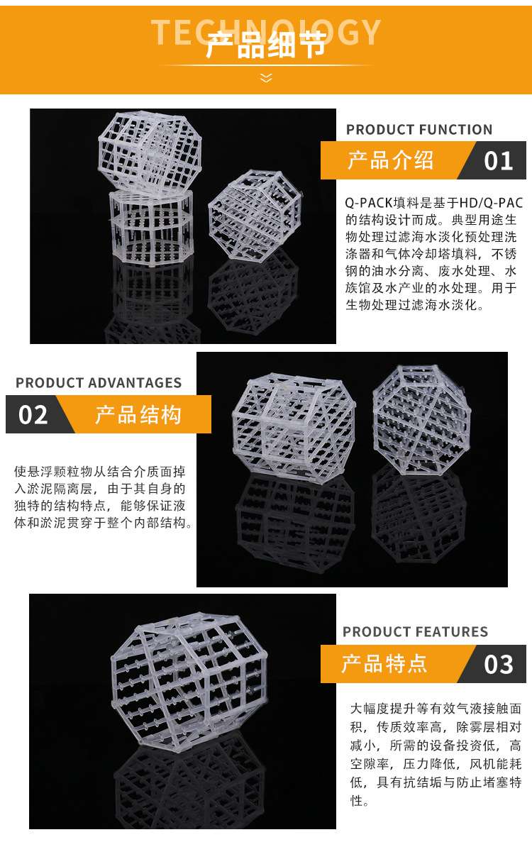 筛网填料:Q-Pack填料是基于HD/Q-PAC的结构设计而成。典型用途生物处理过滤海水淡化预处理洗涤器和气体冷却塔填料,不锈钢的油水分离、废水处理、水族馆及水产业的水处理。用于生物处理过滤海水淡化预处理,大幅提升等有效气液接触面积,传质效率高,除雾层相对减小,所需的设备投资低,高空隙率,压力降低,风机能耗低,具有抗结垢与防止阻塞特性。