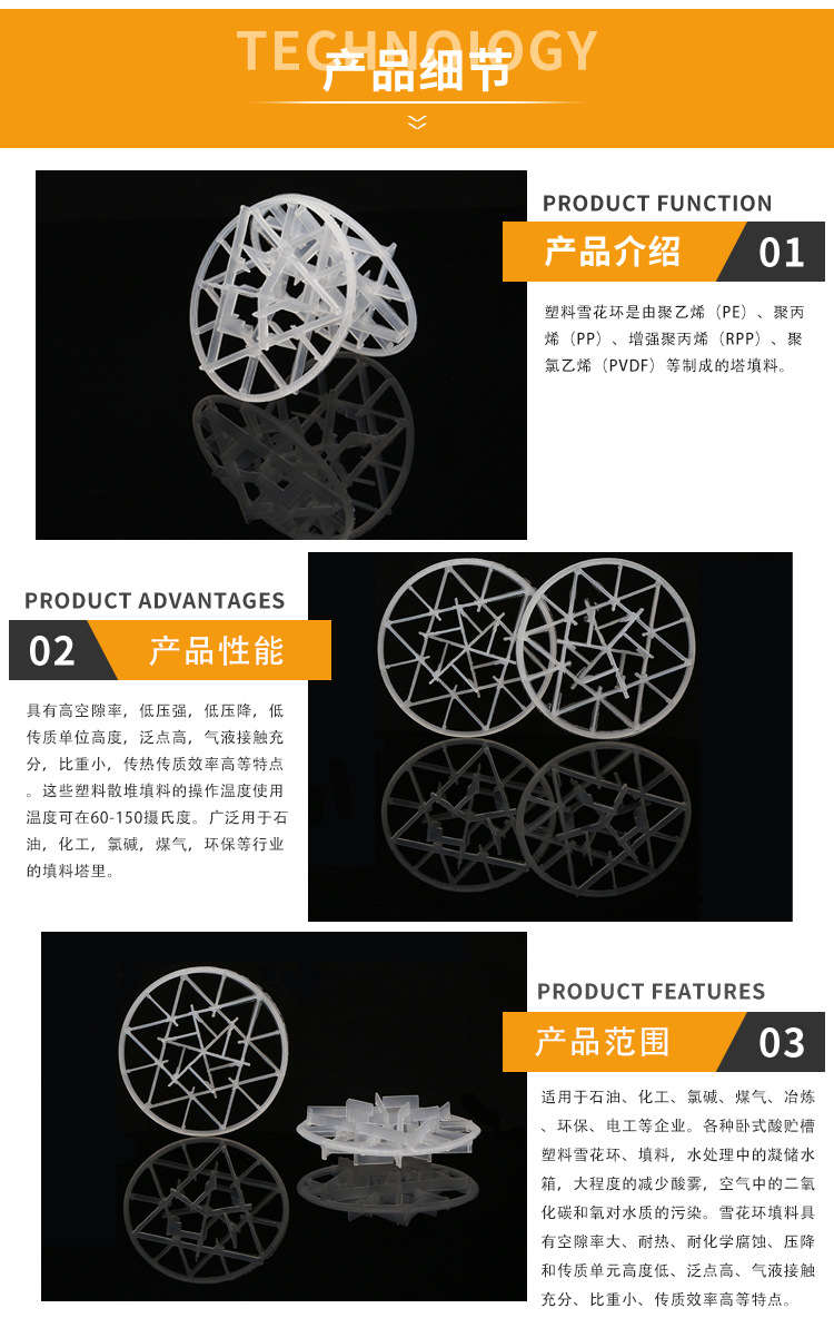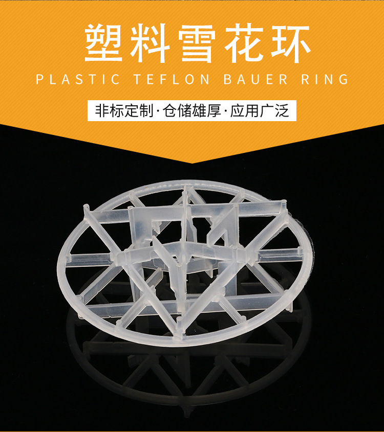 塑料雪花环是由聚乙烯(PE)、聚丙烯(PP)、增强聚丙烯(RPP)、聚(PVC)、氯化聚(CPVC)、聚偏氟乙烯(PVDF)等制成的塔填料。具有高空隙率,低压降,低传质单位高度,泛点高,气液接触充分,比重小,传热传质效率高等特点。这些塑料散堆填料的操作温度使用温度可在60-150摄氏度。广泛用于石油,化工,氯碱,煤气,环保等行业的填料塔里。