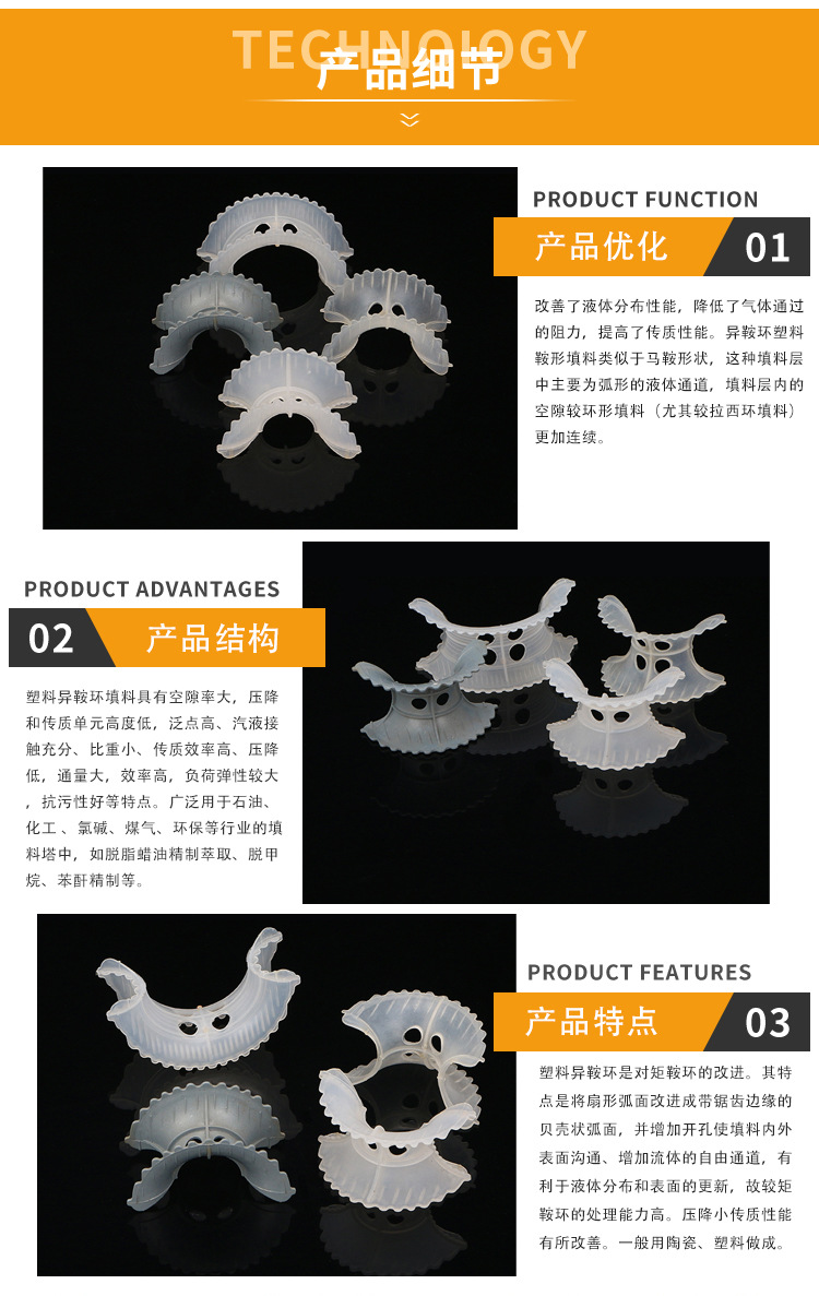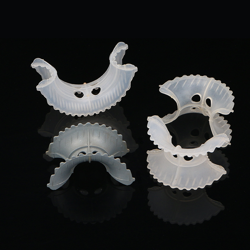 是20世纪70年代美国Noton公司对普通矩鞍环填料作出了改进,将扇形弧面改成锯齿状,并在鞍背上增加了开孔,这样填料层内的通道更加通畅,改善了液体分布性能,降低了气体通过的阻力,提高了传质性能。异鞍环塑料鞍型填料类似于马鞍形状,这种填料层中主要为弧形的液体通道,填料层内的空隙较环形填料(尤其较拉西环填料)更加连续。