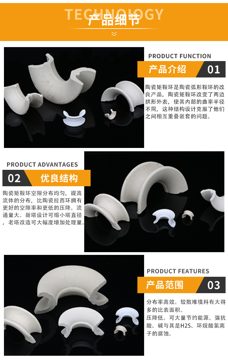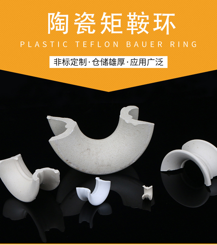陶瓷矩鞍环是陶瓷弧形鞍环的改良产品,陶瓷矩鞍环改变了两边拱形外表,使其内部的曲率半径不同,这种结构设计克服了他们之间相互重叠嵌套的问题,陶瓷矩鞍环空隙分布均匀,提高流体的分布,比陶瓷拉西环拥有较好的空隙率和更低的压降。
