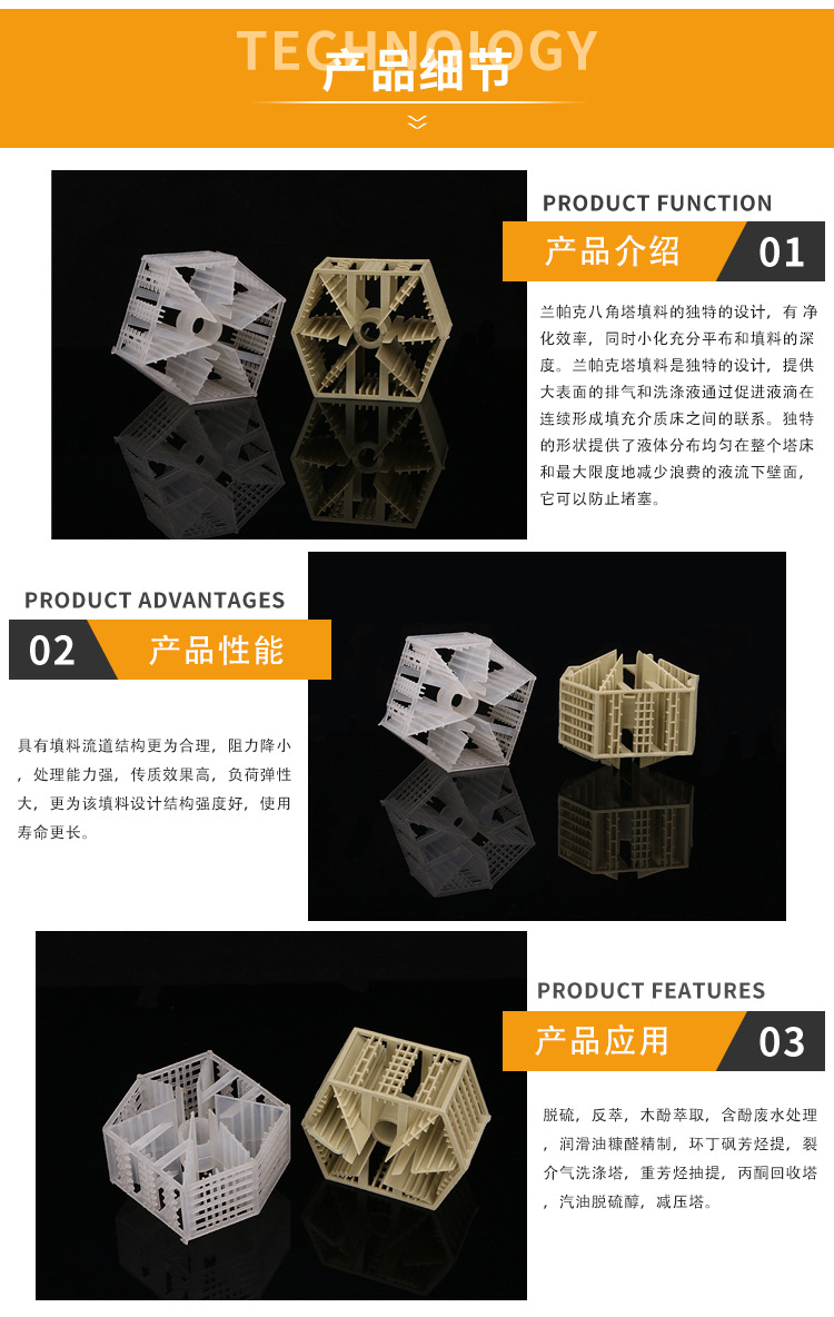 兰帕克八角塔填料的独特的设计,有净化效率,同时小化充分平布和填料深度。兰帕克塔填料是独特的设计,提供大表面的排气和洗涤液通过促进液滴在连续形成填充介质床之间的联系。独特的形状提供了液体分布均匀在整个塔床和限度地减少浪费的液流下壁面,它可以防止堵塞。