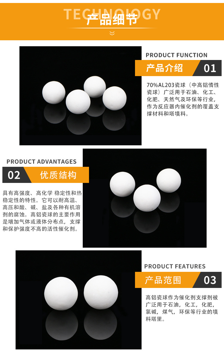 ●惰性氧化铝瓷球是一种高强度、高空隙率的新型支撑、覆盖及保护催化剂用球形支撑保护填料。