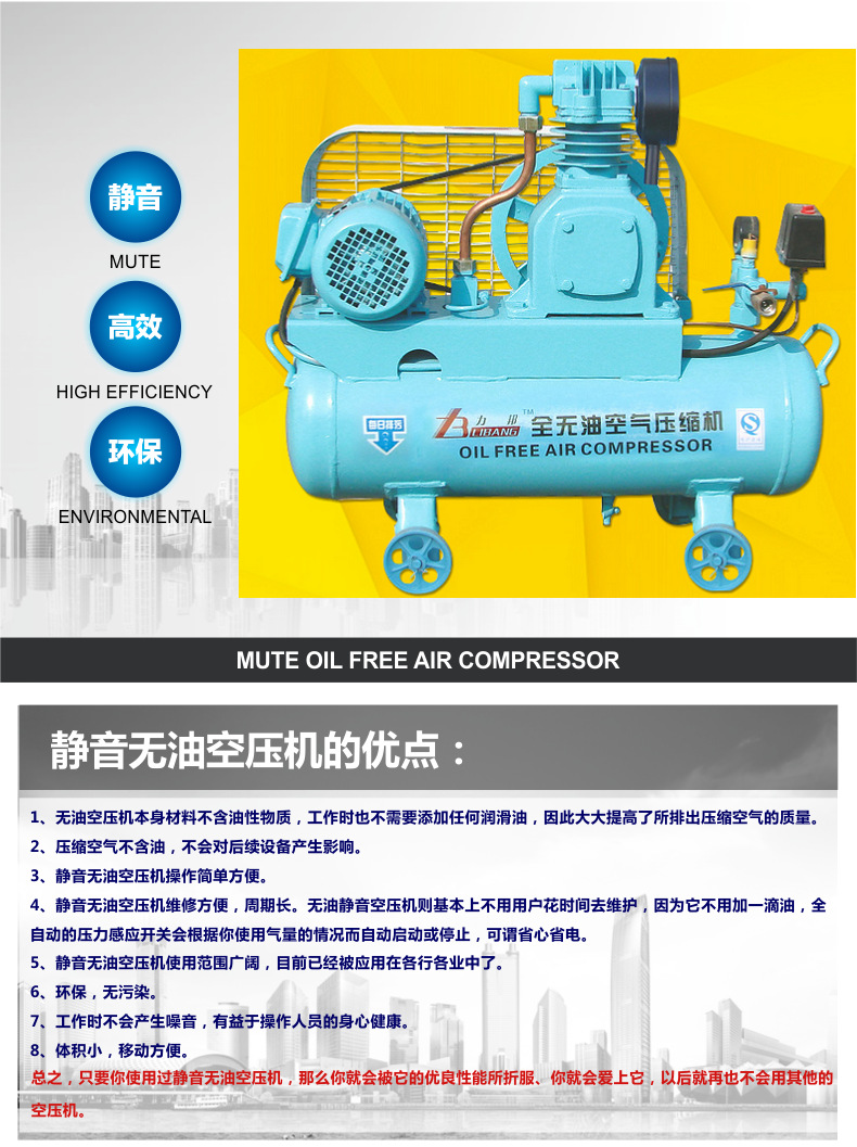 全无油空气压缩机(以下简称空压机),因能够提供没有油污染的、纯净环保气源而广泛用于、养殖、食品、医药、健身、美容、化工、科学试验等领域,也可以当真空泵使用。其主要特点如下: