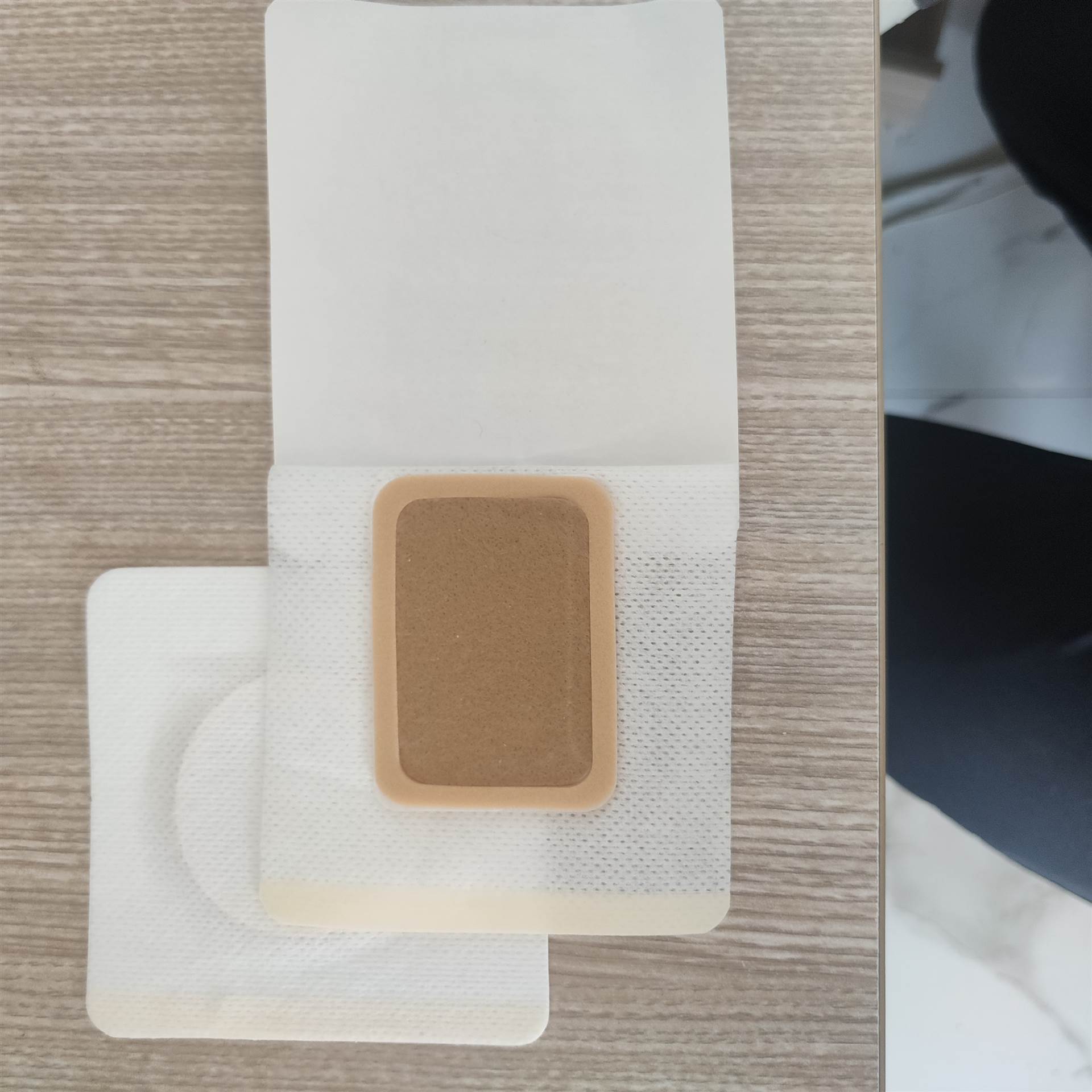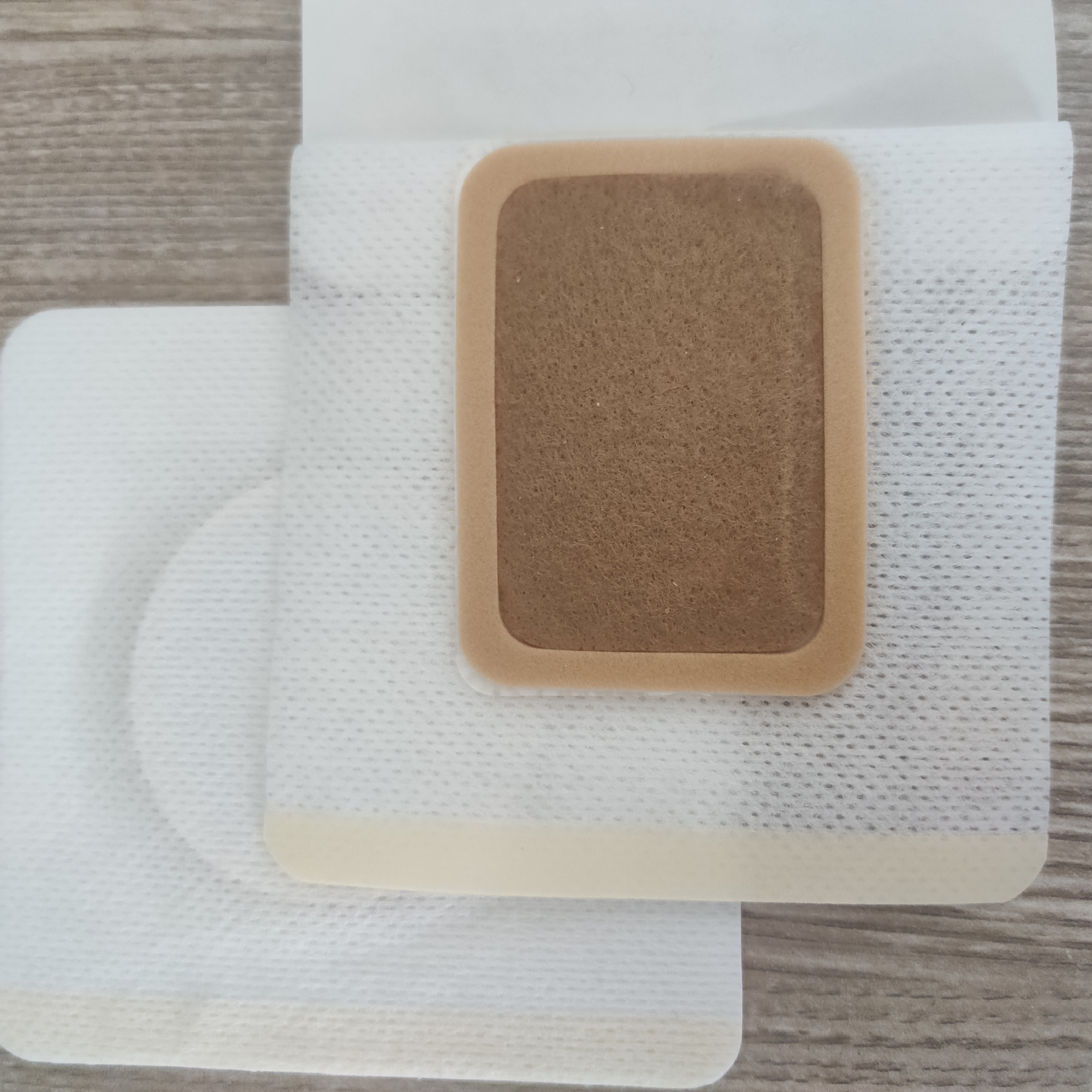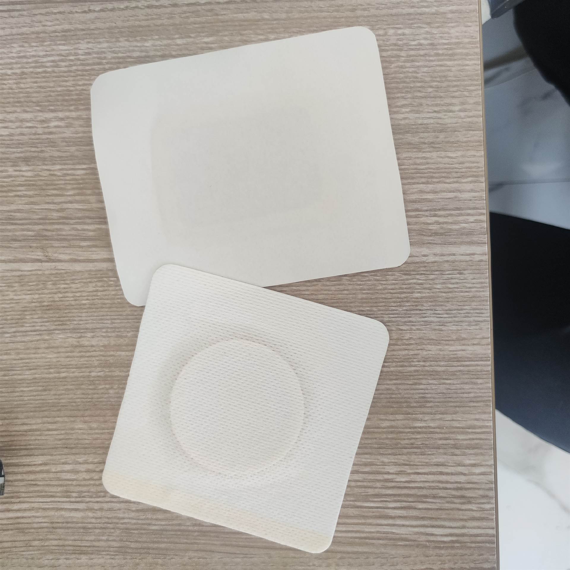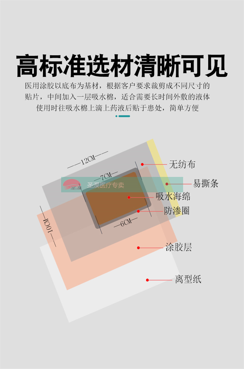 以医用涂胶底布为基材,根据客户要求裁切成不同大小的贴片,中间加入一层吸水棉,适合需要长时间外敷的液剂。使用时往吸水棉滴上药液后直接贴到患处,简单方便。
