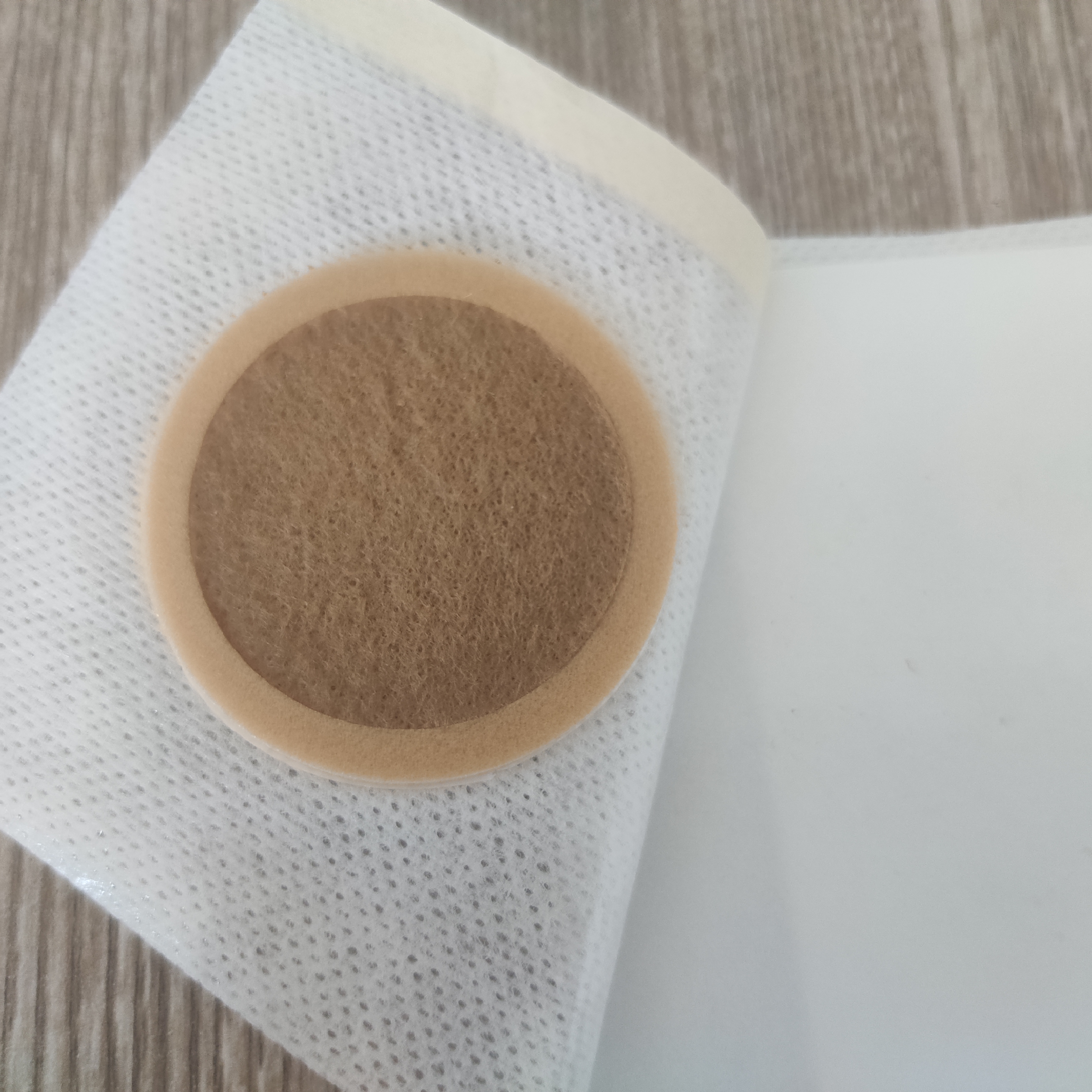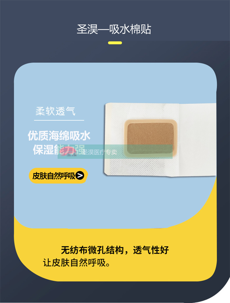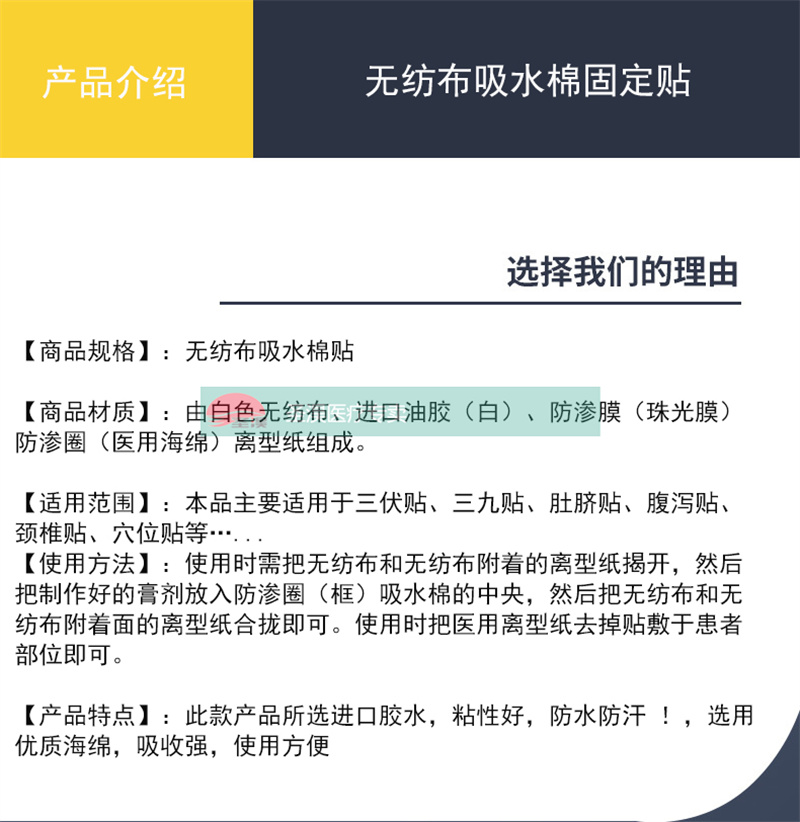 以医用涂胶底布(通常用水刺布、弹力布)为基材,根据客户要求裁切成不同大小的胶贴,中间加入一层吸水棉,外加泡棉圈(白色或者肤色)固定,吸水棉敷贴可以直接加液体或者精油,直接贴敷,也可以加药粉调和膏,进行贴敷。