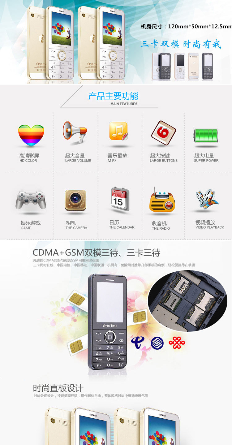 双模3待 全网通 超长待机 三星屏 三卡三待 电信CDMA+移动联通 待机1个月: