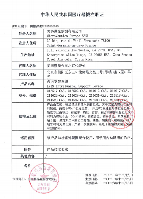 产品由支架、输送导丝和导入鞘管组成。其中支架为镍钛合金材 料制成,两端各有4个钽标记带, 并且有2根螺旋形的钽标记带 输送导丝由芯丝、标记带、绕丝、管体、粘合剂和警示标记组成, 材料为镍钛合金、304不锈钢、铂铱合金、铂钨合金、聚酰亚胺、 粘合剂、聚对苯二乙二醇酯、油墨、硬化剂、缓凝剂;导入 鞘管材料为聚。产品一次性使用,经电子束辐射灭菌,
