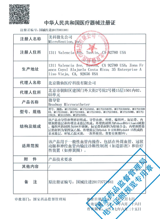 美科微先 微导管 ,MC172150SX 该产品由导管和塑形杆组成。导管由座、外壁、编织丝、标记带、内 壁润滑涂层和外壁亲水涂层组成。外壁的材料为Pebax和Grilamid树脂 ,编织丝的材料为304不锈钢,标记带的材料为铂依合金,内壁润滑涂 层的材料为聚四,外壁涂层为Hlydak B-23K和HydakA-15组成的 亲水涂层。灭菌, 一次性使用。