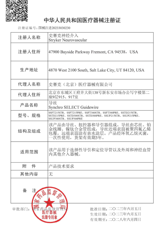 史赛克 导丝 SSTD215STR 该产品由导丝、扭控器和导引器组成。导丝由芯丝、铂 金线圈、镍钛合金管组成,导丝近端表面被聚四 包覆,远端表面涂有亲水涂层。产品经灭菌, 一次性使用
