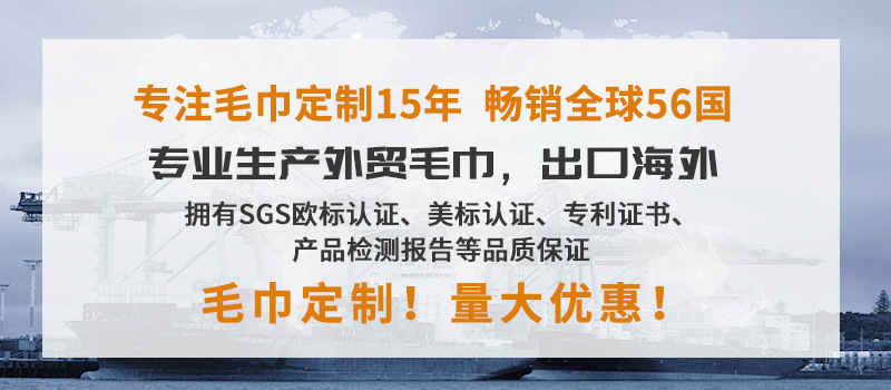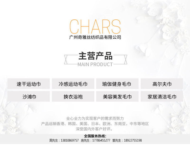 主营产品:速干运动巾、瑜伽健身毛巾、冷感运动毛巾、换衣浴袍、高尔夫巾、厨房毛巾、家居清洁毛巾、美容美发毛巾、沙滩巾。