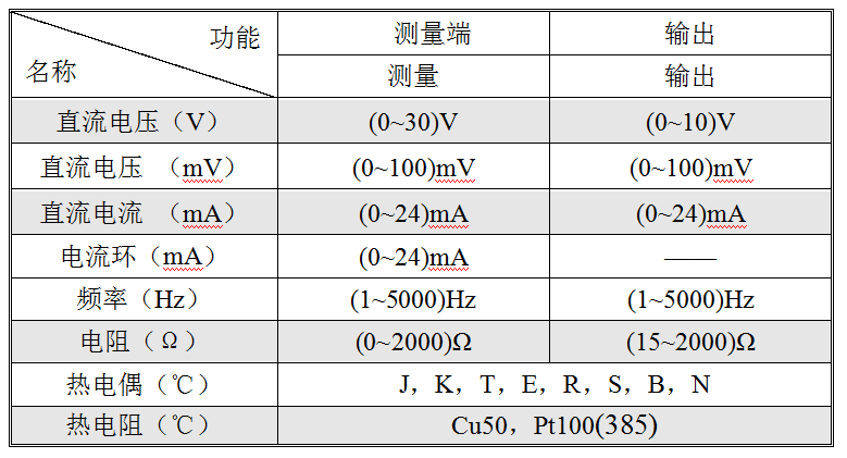 测量和输出功能一览表