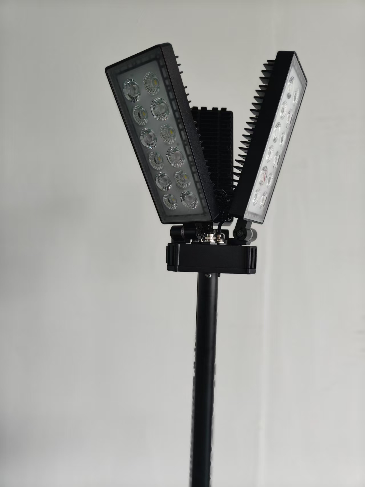 1.灯杆采用4节升缩杆来实现灯头高度的调节升起灯具高度大于4米。