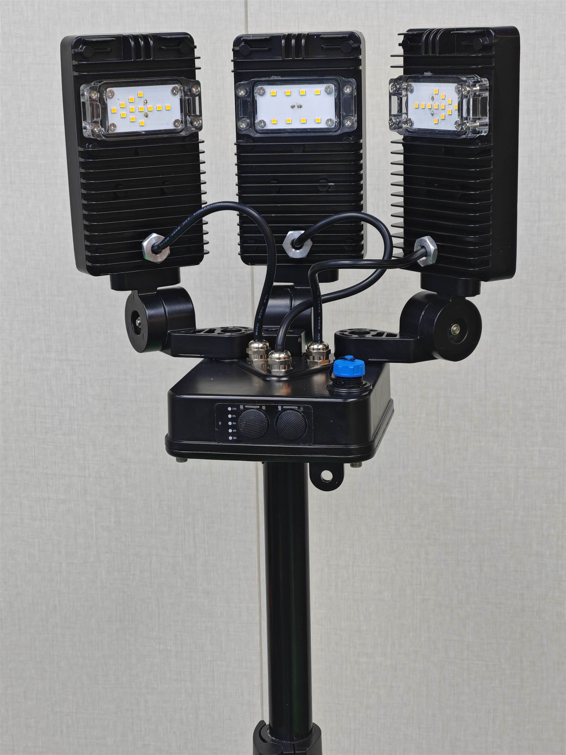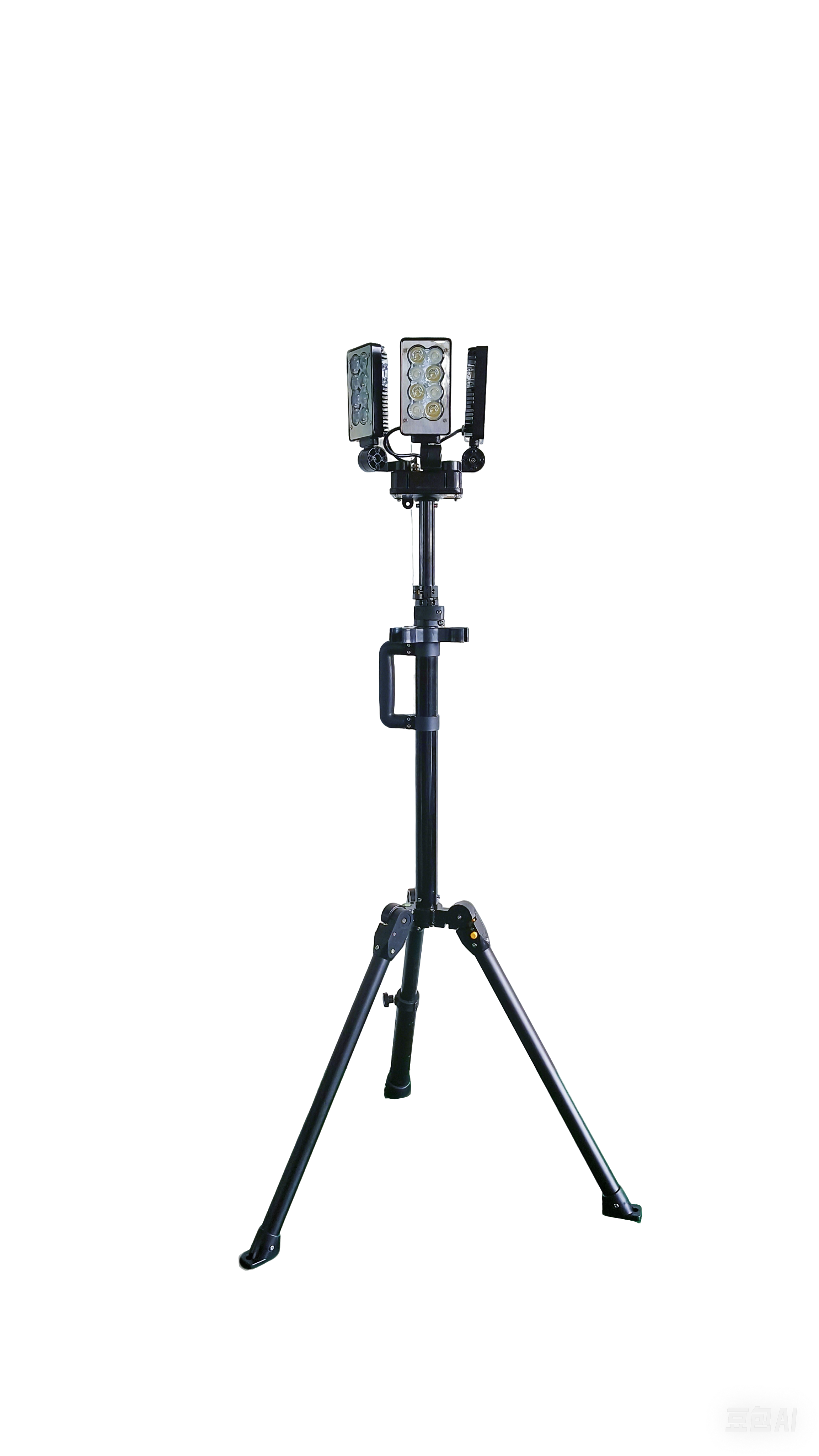 3. 采用三灯头设计,可水平、垂直调节照射方向、照射角度,实现三个方向360°环照和单侧照明,可通过手动升缩杆实现灯头高度的调节,**升起高度达到2.3m,可满足不同场所照明需求;