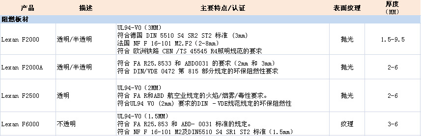 高级阻燃板材:提供透明及不透明选择,除了极佳的阻燃性能外,它还具有高耐冲击性能,良好的硬度和强度以及优异的可成型性。根据不同的应用领域通过了不同的认证。