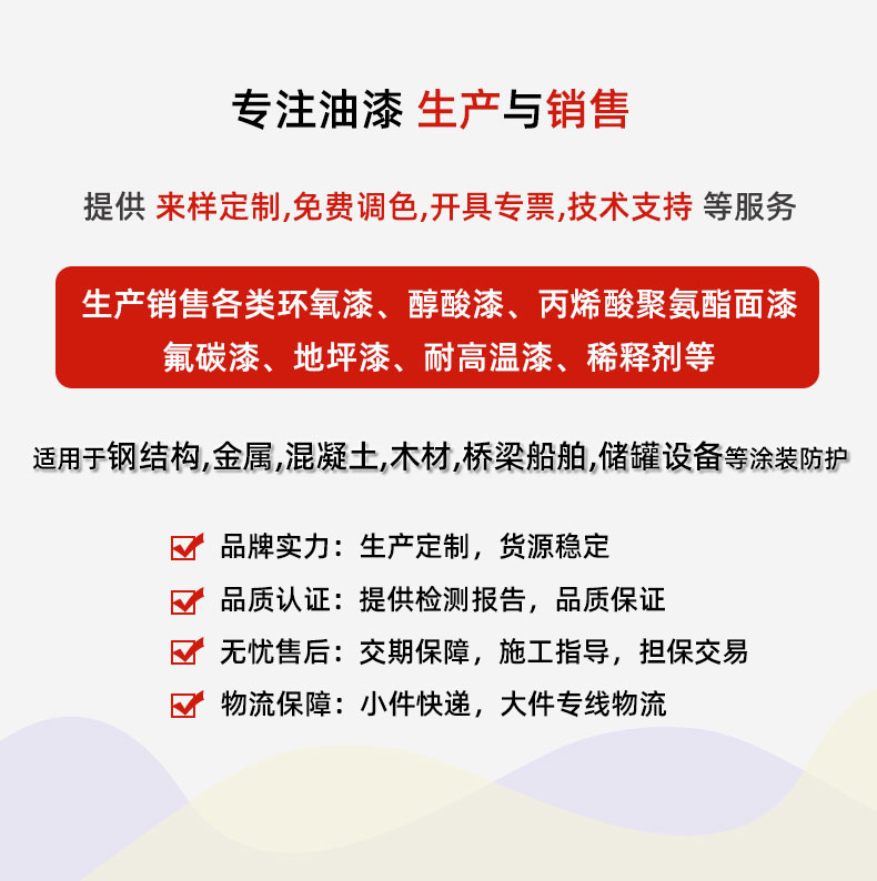 亚盛涂料拥有完整、科学的质量管理体系,公司主营氟碳漆,环氧富锌底漆,醇酸漆,酸聚氨酯面漆,环氧漆,地坪漆,防火涂料,硝基漆,氨基烘干漆等产品。