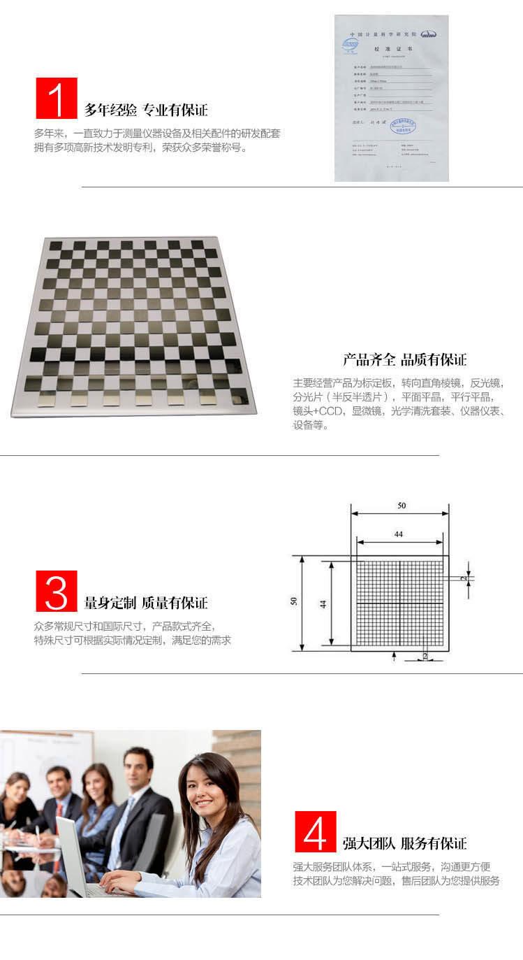 东莞市准纳光电科技有限公司通过“自主研发”、“引进消化吸收再创新”及“产学研结合”等发展模式,致力于测量仪器设备和相关配件的研发配套。公司内主要经营产品为玻璃线纹尺、高精度标定板、转向直角棱镜,反光镜,分光片(半反半透片)、平面平晶、平行平晶、镜头+CCD、显微镜,光学清洗套装、仪器仪表、光学加工设备等。公司拥有完整、科学的质量管理体系,在追求企业发展的同时,公司特别注重企业管理和售后服务,公司以的质量和服务赢得广大客户的青睐,公司的诚信、实力和产品质量获得业界的认可。