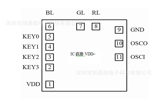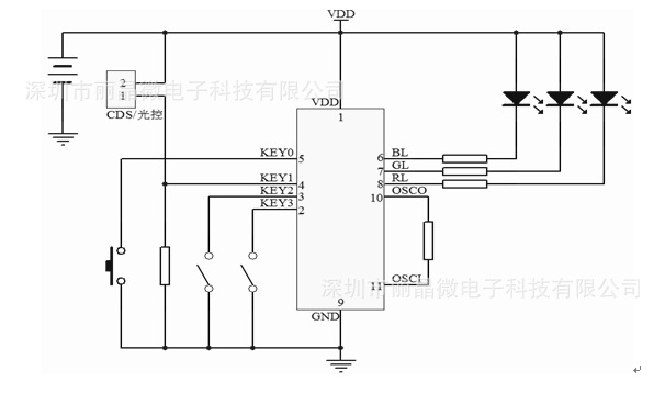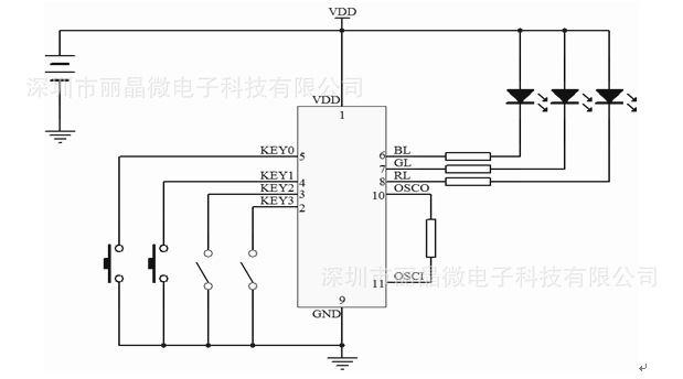 KEY1按键为ON/OFF功能,OSC电阻R1可不接,若要加快LED变化速度,可外加振荡电阻调整,KEY2,KEY3选择第几段花样。