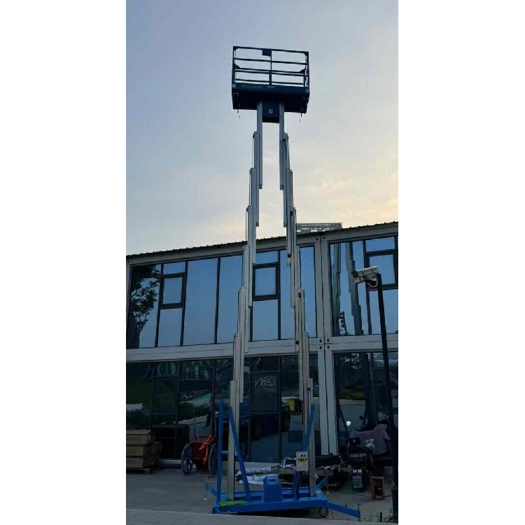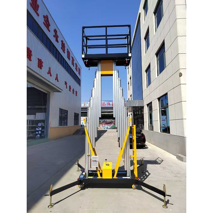 铝合金升降机桅柱支撑作业平台同步升降,支退结构同单桅柱式平台,具有大的载重量和工作稳定性。整体升降式护栏装置,强度好,运输时大幅度地降低整机高度,装卸十分方便,通过一次升降即可完成装配或拆卸。