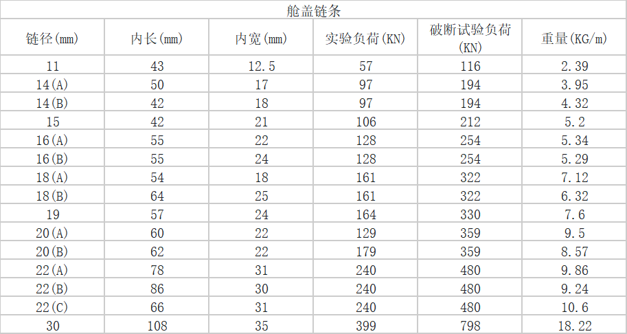 执行标准 : 船用舱盖链条生产执行了GB/T 12718-2009 ,常用规格 11*43毫米 、14*50毫米 16*55毫米 18*64毫米 22*86毫米等